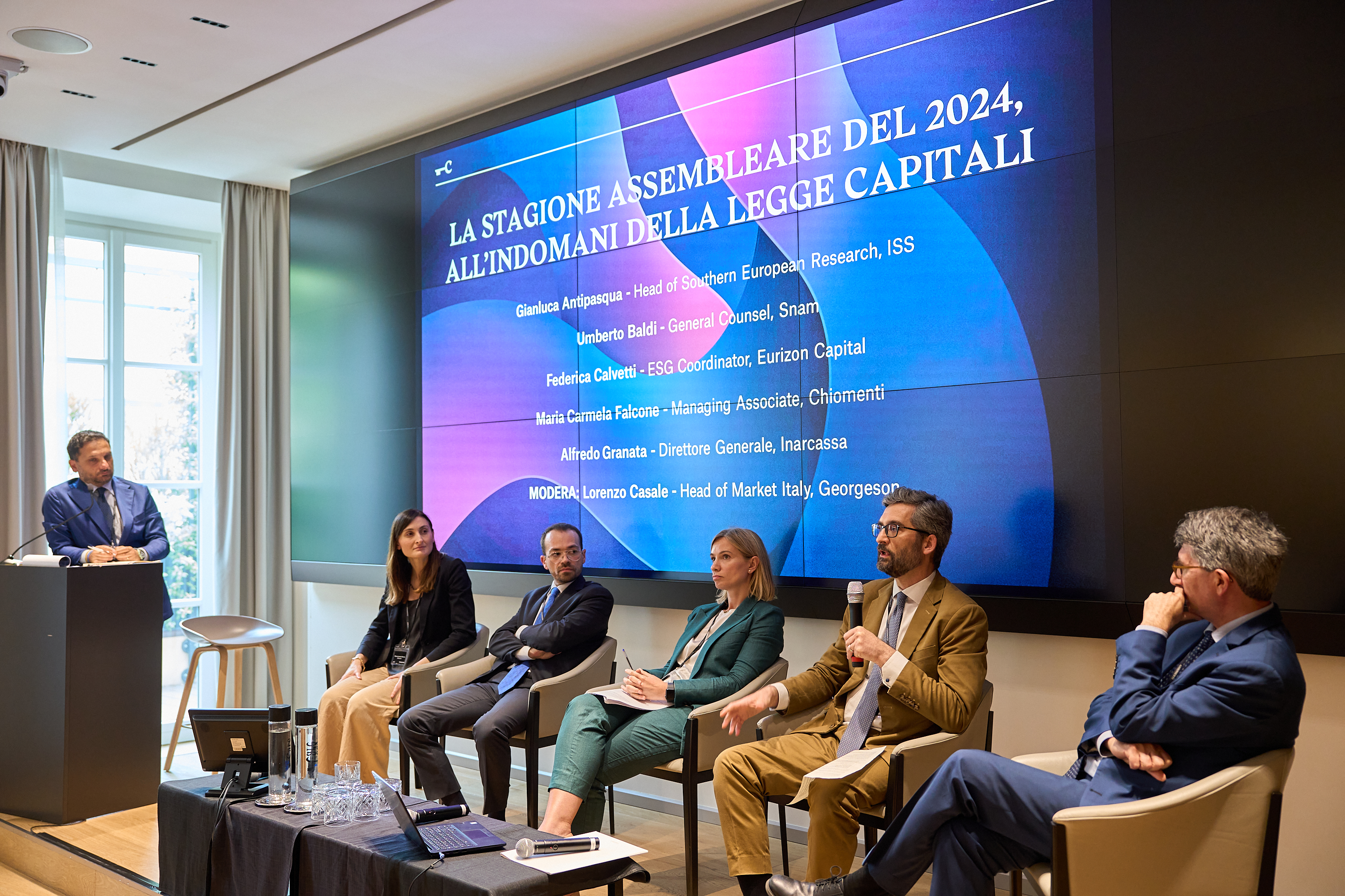 Paolo Valensise, Partner and Professor of Commercial Law at the University of Roma Tre, provided some reflections on the aforementioned developments and their implications, emphasizing how listening to market players is fundamental in order to have a wide, articulate and heterogeneous set of information in order to be able to conduct thorough evaluations. His speech introduced a first panel discussion, which analyzed the 2024 assembly season following the Capital Law, with contributions from Maria Carmela Falcone, Managing Associate, Gianluca Antipasqua, Head of Southern European Research at ISS, Umberto Baldi, General Counsel at Snam, Federica Calvetti, ESG Coordinator at Eurizon Capital, and Alfredo Granata, General Manager at Inarcassa, with moderation by Lorenzo Casale, Head of Market Italy at Georgeson. The impact of the regulatory framework introduced by the Legge Capitali was examined not only from a legal perspective, but also by integrating the different experiences and perspectives of investors, issuers and proxy advisors, taking into account how the evolutionary path initiated by the Capital Law is still ongoing and there is still room for further reflection.