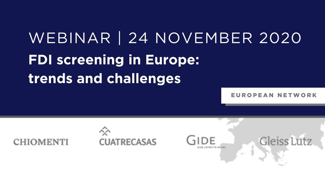 On November 24, 2020 Chiomenti, with leading law firms Partners Cuatrecasas, Gide Loyrette Nouel and Gleiss Lutz, and Partner Andrea Sacco Ginevri attending as speaker, has held a webinar on “FDI screening in Europe: trends and challenges”.