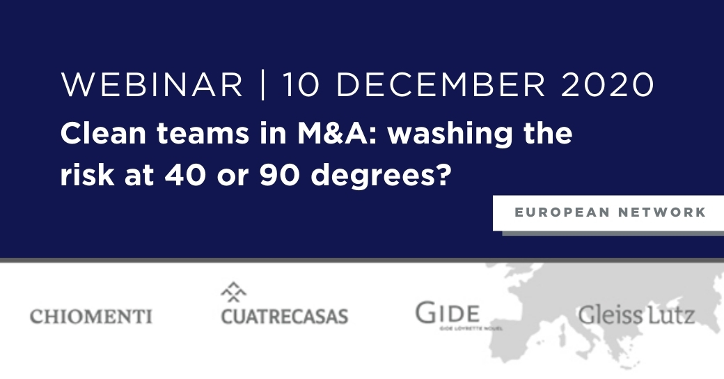 On December 10, 2020 (1 p.m. CET) Chiomenti, with leading law firms Partners Cuatrecasas, Gide Loyrette Nouel and Gleiss Lutz, and Patrick Actis Perinetto attending as speaker, holds a webinar on “Clean teams in M&A: washing the risk at 40 or 90 degrees?”.