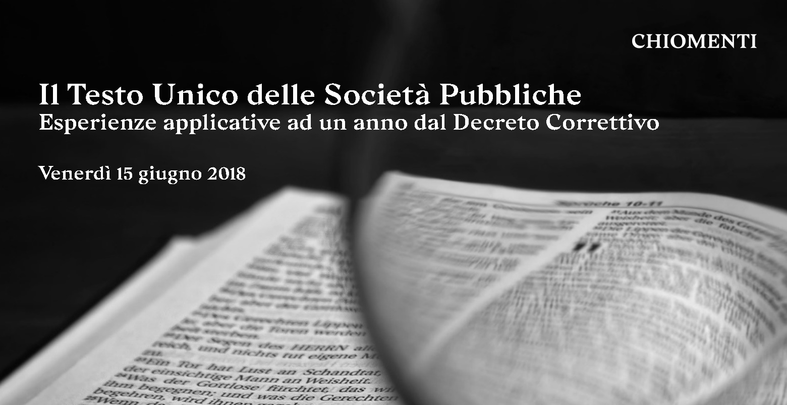 Chiomenti organizza il seminario dal titolo “Il testo unico delle società pubbliche - Esperienze applicative ad un anno dal Decreto Correttivo”, in programma la mattina di Venerdì 15 giugno presso la sede di Roma, in via XXIV Maggio 43.