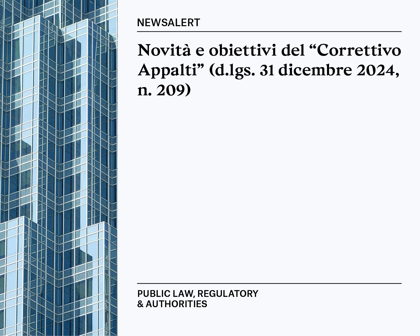 I Professionisti Chiomenti hanno analizzato nell'ultima newsalert le principali novità riguardanti la fase procedurale e l'esecuzione del contratto, tra cui il rafforzamento delle tutele lavoristiche, il potenziamento della digitalizzazione delle procedure, i chiarimenti sulle modalità di partecipazione dei consorzi stabili alle gare d'appalto e gli incentivi all'accesso delle PMI al mercato dei contratti pubblici. Sono state inoltre approfondite le modifiche introdotte alla disciplina del project financing, del subappalto, della revisione dei prezzi e del Collegio Consultivo Tecnico.