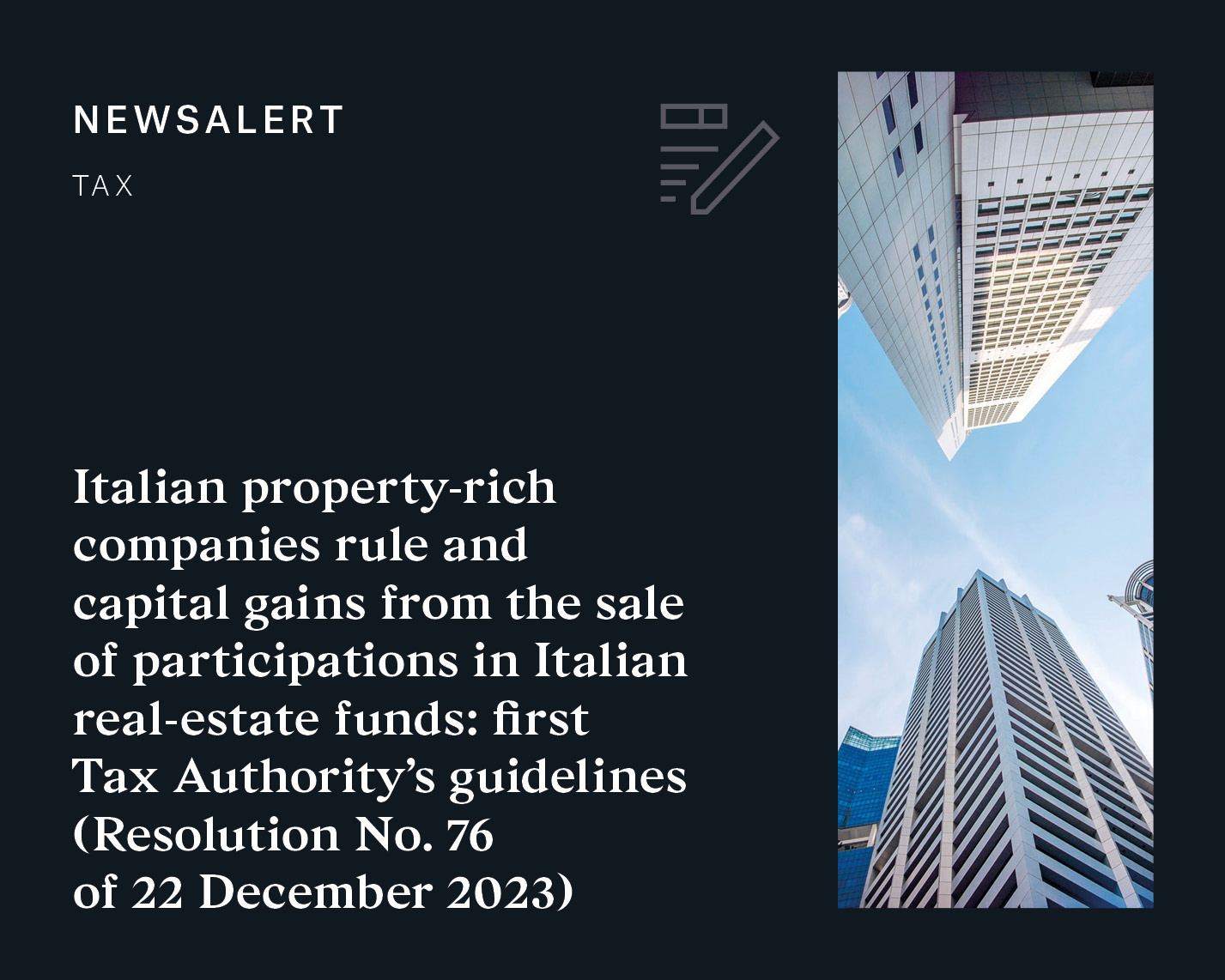 Con la Risoluzione n. 76 del 22 dicembre 2023, l’Agenzia delle Entrate ha fornito i primi (importanti) chiarimenti sull’ambito oggettivo di applicazione del nuovo regime fiscale, in vigore dal 1° gennaio 2023, per le plusvalenze connesse, direttamente o indirettamente, a immobili situati in Italia (c.d. property-rich companies rule introdotta dalla L. n. 197/2022 – “Legge di Bilancio 2023”).