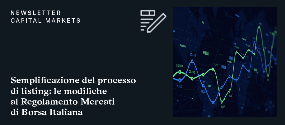 Semplificazione del processo di listing: è online l’approfondimento dei Professionisti Chiomenti che analizza le aree del Regolamento Mercati oggetto di modifica. I cambiamenti, introdotti da Borsa Italiana, in vigore dal 3 ottobre 2022, hanno l’obiettivo di allineare l’assetto regolamentare a quello degli altri mercati comunitari, semplificando il processo di quotazione attraverso la riduzione dei tempi e dei costi di preparazione della documentazione e degli oneri di istruttoria legati all’ammissione, nonché la revisione del sistema delle responsabilità a carico dei diversi attori coinvolti nel processo.