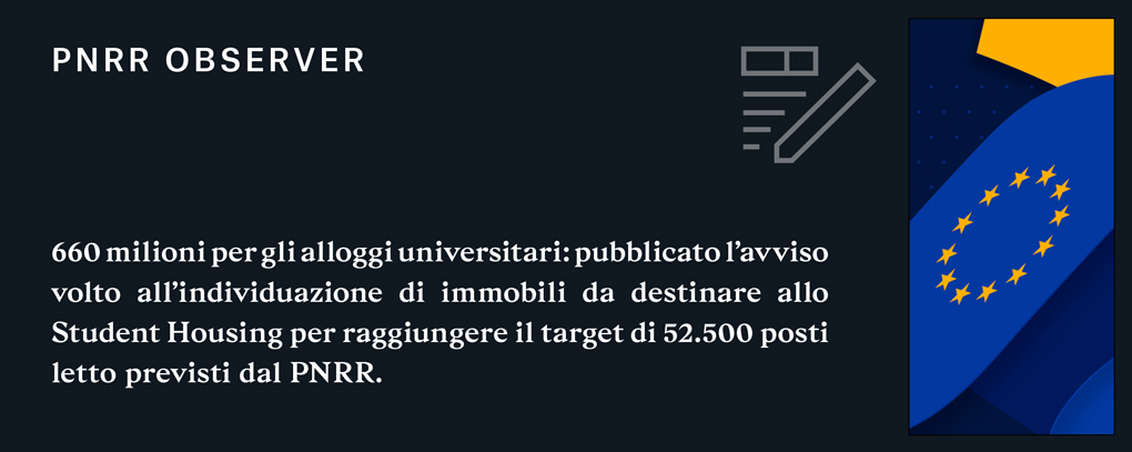 Il Ministero dell’Università e della Ricerca ha pubblicato un avviso per individuare manifestazioni di interesse da parte di soggetti che intendano rendere disponibili immobili da destinare ad alloggi o residenze universitarie per studenti delle istituzioni della formazione superiore. L’obiettivo è raggiungere il target di 52.500 posti letto previsti dal PNRR. Sono stati stanziati 660 milioni di euro di cofinanziamento. Il termine ultimo per inviare le manifestazioni di interesse è l’11 luglio 2023.